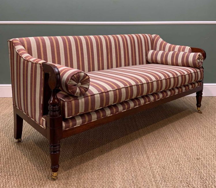 REGENCY STYLE MAHOGANY SETTEE, upholstered in Regency stripe fabric with two bolsters, metal castors, 85h x 180w x 73cm dProvenance: collection of the Late Dai Evans, former Director of Picton Castle and former curator of Petworth HouseComments: Repair to arm