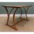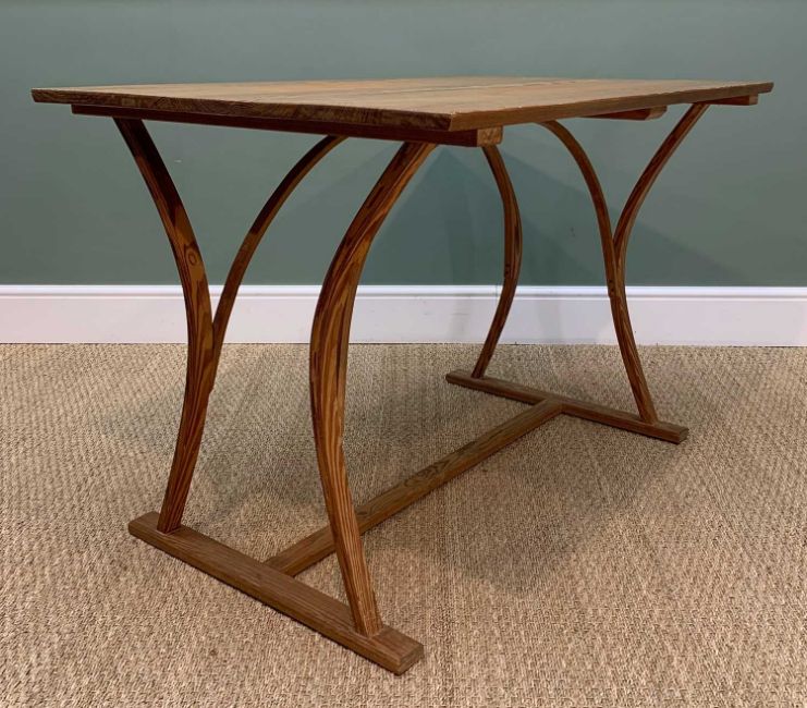 ARTS & CRAFTS STYLE TABLE, knotted pine top, on pitch pine legs with bowed supports, 76h x 114w x 78cms d Provenance: consigned from West WalesComments: table top has small indent as pictured, otherwise sound, frame loose