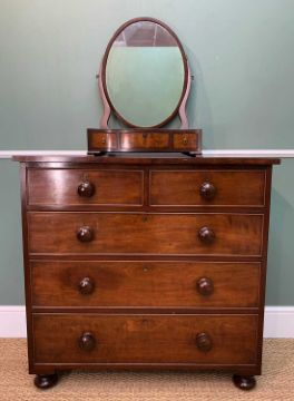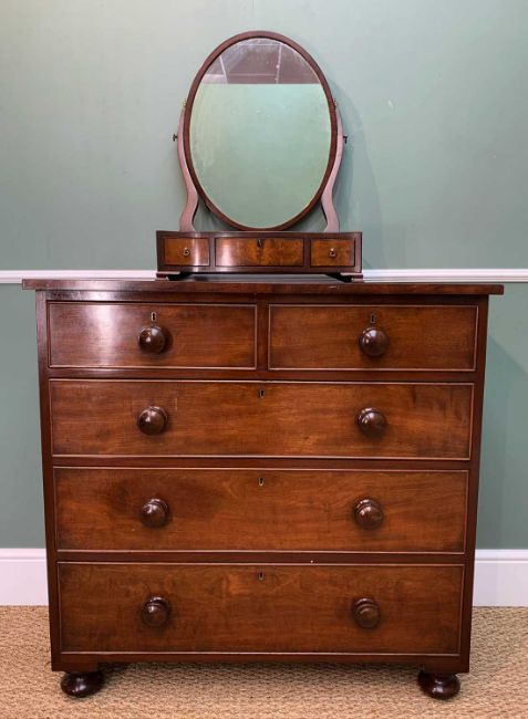 LATE GEORGE III MAHOGANY CHEST & LATER MIRROR, chest with two short over three long graduated drawers, bun feet, turned handles, 94.5h x 97.5w x 43cms d, the dressing mirror with three frieze drawer base, 55h x 48.6cms w (2)Provenance: collection of the Late Dai Evans, former Director of Picton Castle and former curator of Petworth HouseComments: minor stains and veneer losses to chest