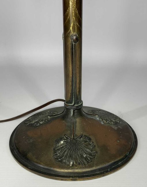 AMERICAN ART NOUVEAU TABLE LAMP, possibly by Miller, with pierced shade fitted with 6 of 6 slag glass panels, floral bud and palm leaf applied column and foot, 50cms hProvenance: private collection CardiffComments: appliques slightly damaged, three glass panes lacking, bulb fittings replaced.