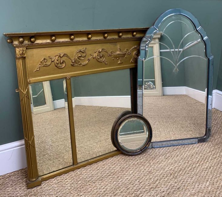 ASSORTED MIRRORS, including white painted architectural mirror, 138h x 105cms w, gilt triple-plate over-mantel mirror, 78h x 128cms w, Art Deco style arched mirror, 90h x 53cms w, and small japaned circular mirror, 25cms (4)Provenance: collection of the Late Dai Evans, former Director of Picton Castle and former curator of Petworth House