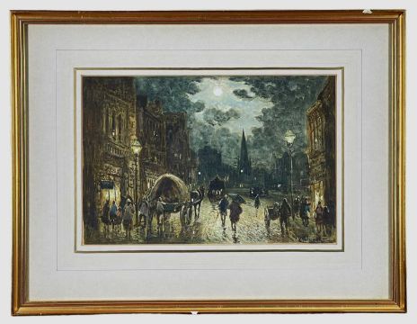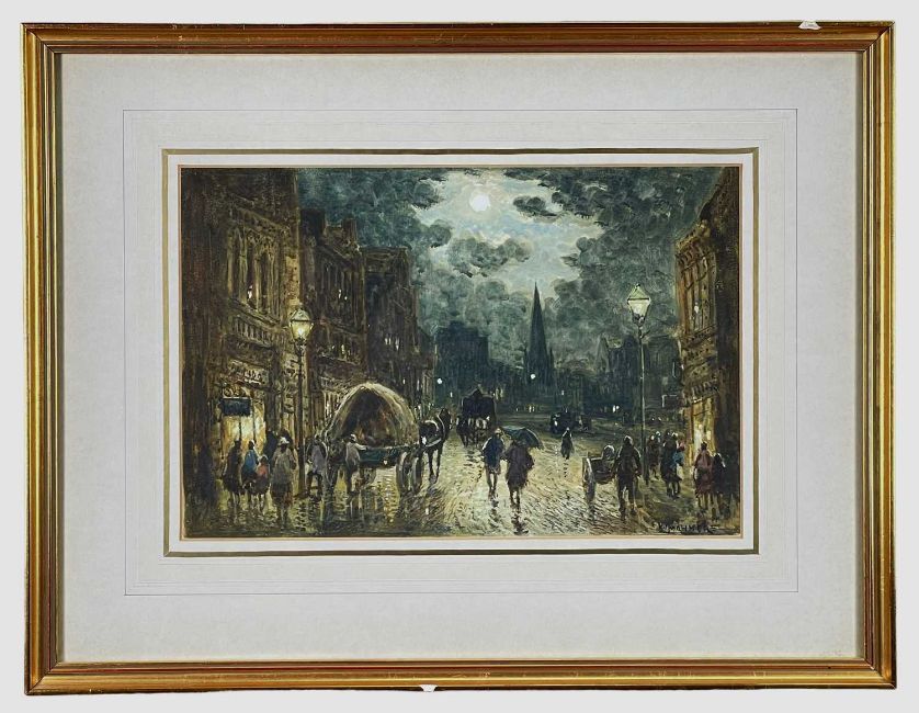 WILLIAM MANNERS (1860-1930) watercolour - busy street under moonlight on a rainy night, signed, 20 x 30cmsProvenance: private collection CardiffComments: framed and glazed, ready to hang
