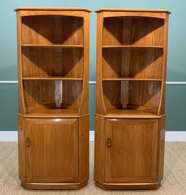 TWO MID-CENTURY ERCOL WINDSOR 743C CORNER CABINETS, gold label, solid elm, two fixed shelves above single-door cabinet, 179h x 73w x 48cms d (2)Provenance: private collection Cardiff