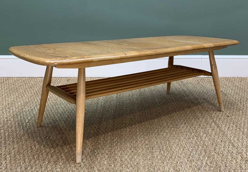 MID-CENTURY ERCOL WINDSOR 459 OCCAISIONAL COFFEE TABLE, blue label, elm and beech, natural finish, magazine rack, 36h x 105w x 44cms dProvenance: private collection CardiffComments: some fading to legs