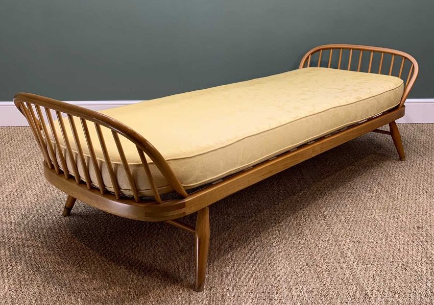 MID-CENTURY ERCOL WINDSOR 355 STUDIO COUCH / DAY BED, natural beech and elm, removable solid plank back (converts to day bed), pale yellow floral cloth upholstery, 206w x 79cms dProvenance: private collection CardiffComments: webbing brittle, some fading, two small cracks to rhs arm, water stains to feet