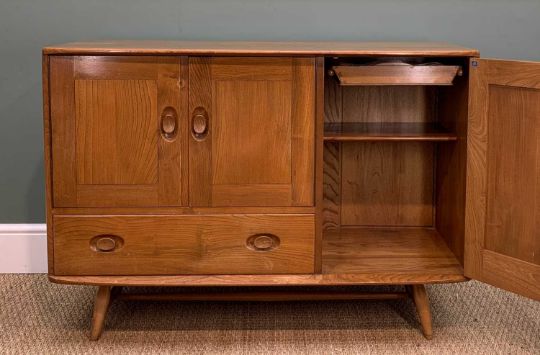 MID-CENTURY ERCOL 366 SIDEBOARD, blue label, solid elm, natural waxed finish, cupboards fitted with adjustable half shelves, right-hand cupboard fitted with cutlery tidy, 81h x 114w x 49cms dProvenance: private collection CardiffComments: light staining to top, slight blooming to apron wax finish