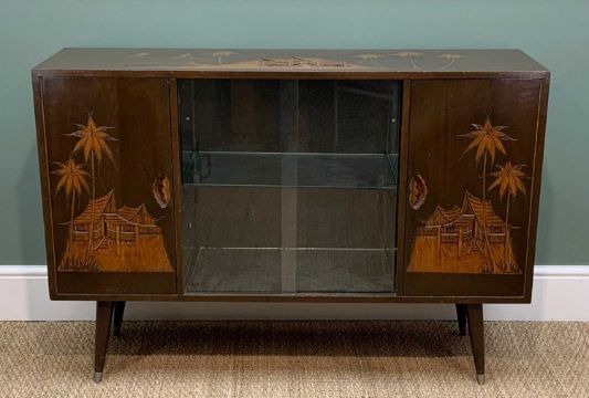 MID-CENTURY CHINOISERIE CARVED SIDEBOARD, central glass sliding doors with internal glass shelving, mirrored sides and base, two side cupboards with shelving and partitioning, 83h x 122w x 38cms dProvenance: consigned from West Wales