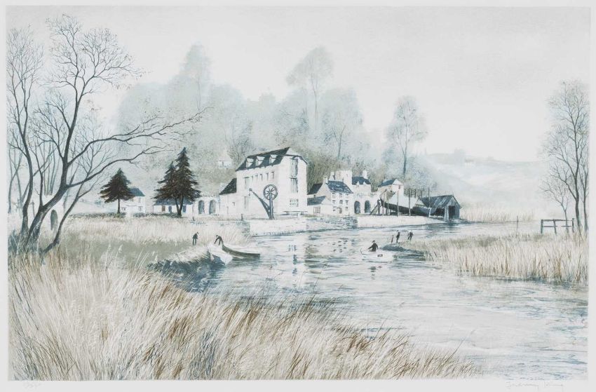 FOUR PRINTS, comprising Benjamin Williams Leader, etching - Lock at Stratford upon Avon, 65 x 80cms; Arthur J Elsley, lithograph - Blind man's Bluff, (I) 50 x 61cms; Jeremy King, two limited edition (113/250) colour lithographs - river fishermen and farm houses, and Mont Saint Michel (I) 41 x 63cms, both signed, numbered in pencil and with blindstamps (4)Provenance: local charity donationComments: all framed ready to hang.