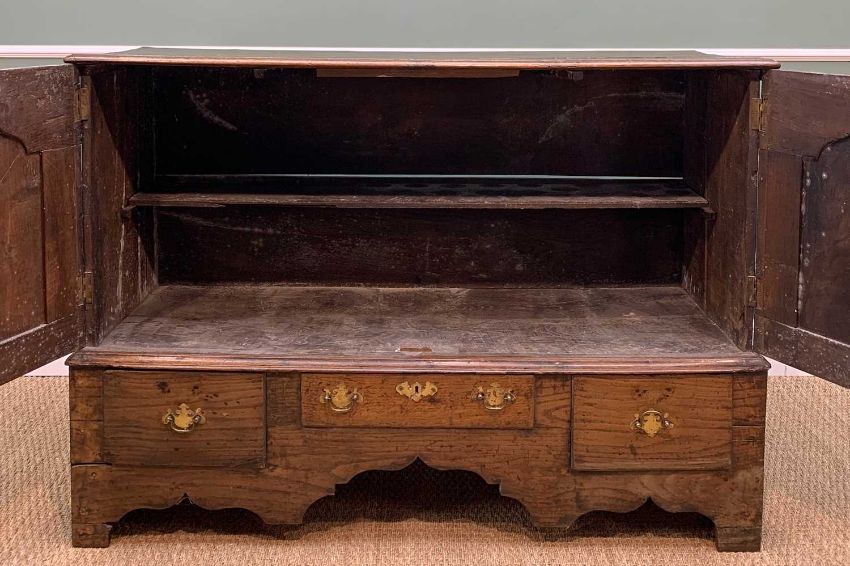 18TH C. WELSH JOINT OAK MULE CHEST, altered to a cupboard with fixed top, interior shelf and apron drawers, 109h x 142w x 53cms dProvenance: consigned via West WalesComments: alterations, top and side panels with infill, old cracks, repairs, old worm front and rear