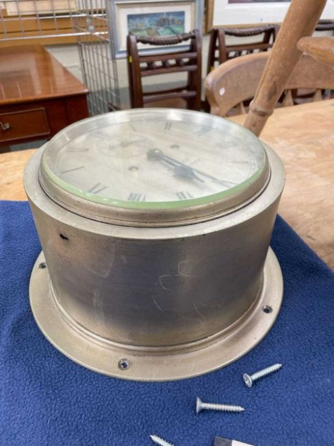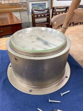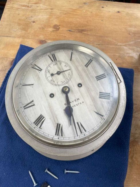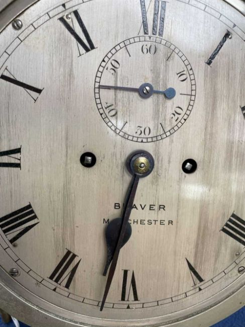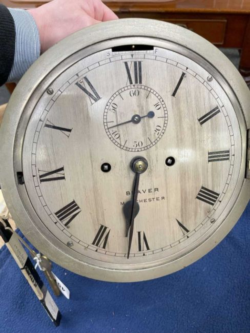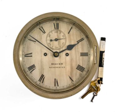 SHIP'S BULKHEAD CLOCK, the dial marked 'Beaver Manchester' with subsidiary seconds dial, two train deadbeat escapement striking 'ship's bells', 24cms diameter, with keyProvenance: private collection Carmarthenshire, believed to be originally from the HMS ConwayComments: good overall, wear and tear commensurate with age, not tested Condition Report:The clock chimes every half an hour