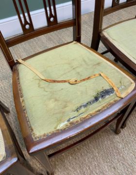 EDWARDIAN THREE-PIECE SALON SUITE, stained beech, parquetry and inlaid, settee 83h x 123w x 53cms d, armchairs 80h x 57w x 47cms d, together with FOUR EDWARDIAN INLAID SIDE CHAIRS, 90h x 43w x 41cms d (7)Provenance: private collection GloucestershireComments: fading to sofa chair back rail, upholstery stained, dining chairs slightly loose
