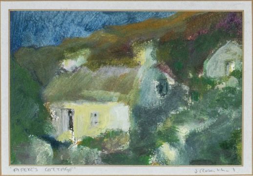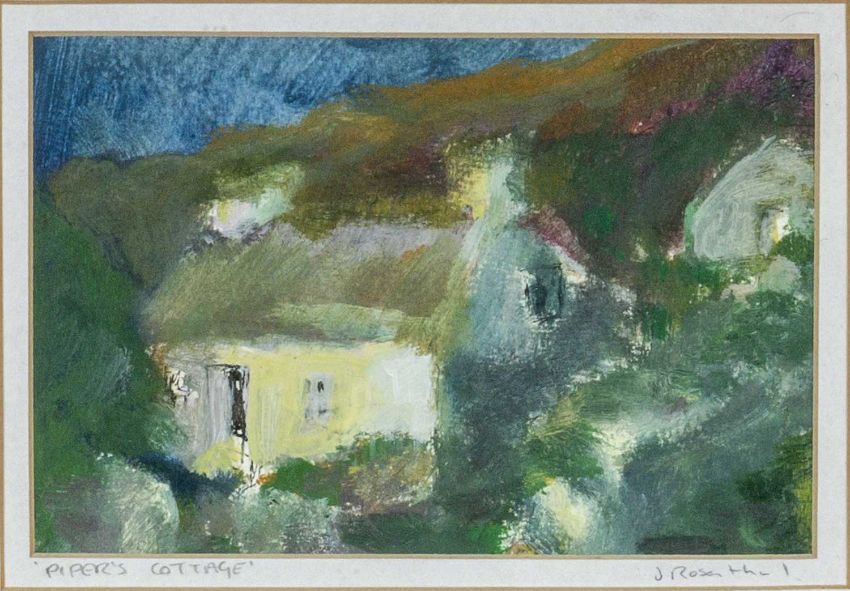 ‡ JUDITH ROSENTHAL acrylic on paper - John Piper's Cottage, signed and titled on mount and on Martin Tinney Gallery label verso, c. 1994, 9.5 x 15cms; together with three small watercolours by J . Alhema of Cardiff Market, c. 1986 (4)Provenance: private collection south WalesComments: framed