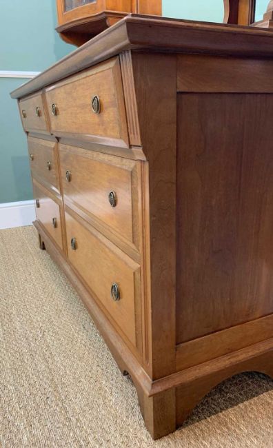 ARTS & CRAFTS STYLE MIRROR-BACK BUFFET, central mirror flanked by two lead glazed cupboards, above chest base of six graduated short drawers, 191h x 155w x 55cms dProvenance: consigned via west Wales
