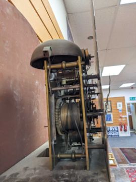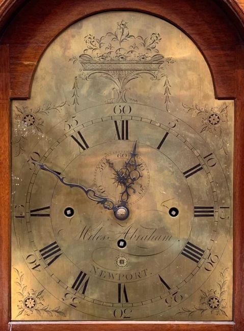 18TH C. OAK 8-DAY MUSICAL LONGCASE CLOCK, Miles Abraham, Newport Pagnell, Bucks, three-train movement striking on 8 bells, 11in. brass Roman and Arabic dial with engraved spandrels and breakarch, orb & spire finials, 242h x 50w x 25cms dProvenance: private collection GloucestershireNotes: Miles Abrahm listed as working 1772-1778.-Comments: hour hand does not advance past 1 o'clock