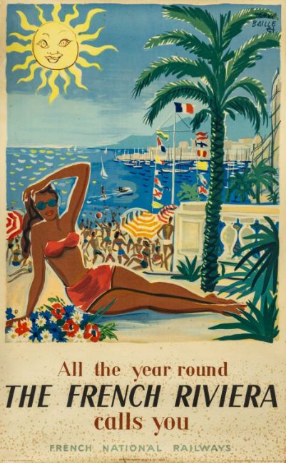 FOUR VINTAGE FRENCH RAILWAY POSTERS, colour lithographs, comprising Herve Baille 'The French Riviera', ' Mont Blanc', Devos 'Normandie', and Andre Strauss 'Bretagne' all approx. 100h x 62cms w (4)Provenance: deceased estate south Wales.Comments: variously tinted, one foxed, one torn corner, marginal tears to other and creasing, inspection advised, see images, rolled, unframed