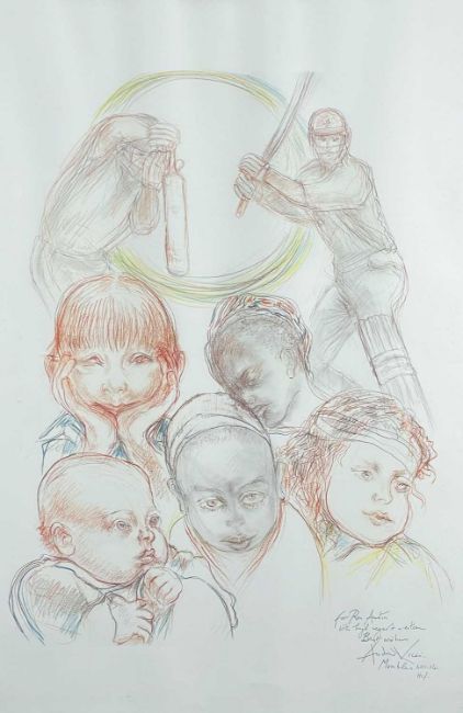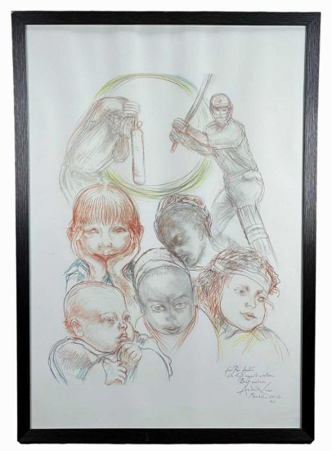 ‡ANDREW VICARI colour print - untitled, two cricketers and five children, personally signed and dated 2014, 96 x 66cmsProvenance: private collection, consigned via our Carmarthen office, inscribed with message to the vendorComments: framed and glazed, ready to hang.
