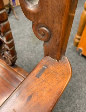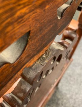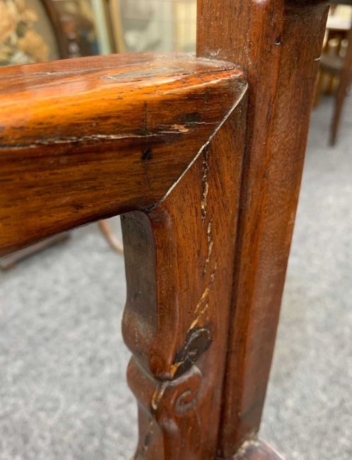 CHINESE HARDWOOD CARVED ARMCHAIR, late Qing Dynasty, probably Hongmu, pierced splat and sides carved with bats (fu) and shou character medallion, panelled seat, stretchers, scrolled feet, 97h x 62w x 47cms dProvenance; private collection vale of GlamorganComments: back splat damaged/loose, minor stains, front stretcher loose