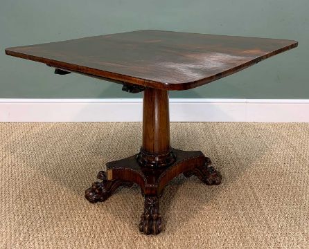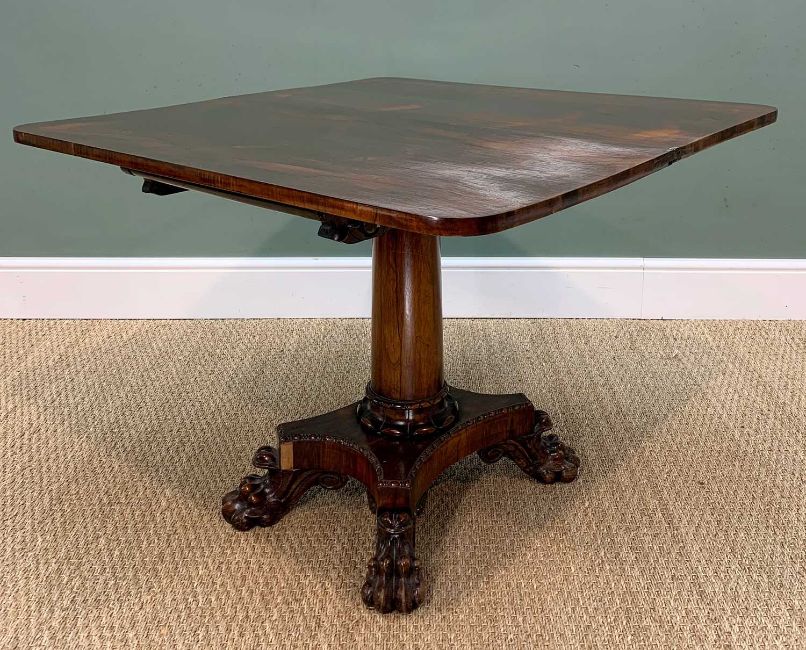 EARLY 19TH C. TEA TABLE, fold over swivel top, baize lined storage compartments, 71h x 92x 45cms dProvenance: private collection CardiffComments: repair to top, veneer losses, top appears to have been re-varnished and is rough in patches
