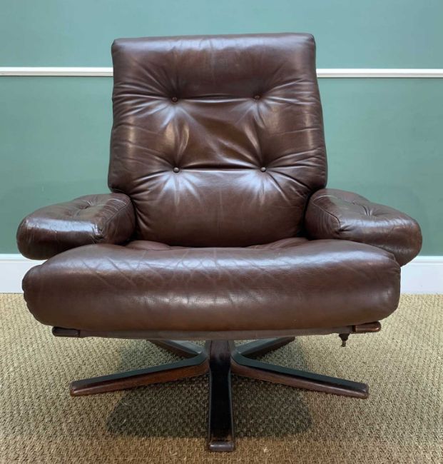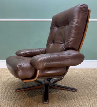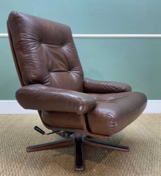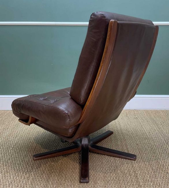 MID-CENTURY GOTE MOBEL SWEDISH SWIVEL ARMCHAIR, brown leather upholstery, rosewood frame and base, with label, lockable tilt action, 100h x 84w x 80cms dProvenance: consigned West WalesComments: stud covers missing on both arms, no height adjustment