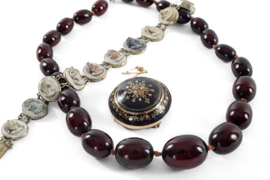 9CT GOLD PIQUE WORK BROOCH, LAVA BRACELET & BEAD NECKLACE, the brooch of domed circular form with floral pique work decoration, 3.8cms diam., 10-paneled white metal-framed bracelet with carved classical busts in relief, 18cms long, and graduated oval red bead necklace, 44cms long (3)Provenance: private collection south Wales.Comments: generaly good.