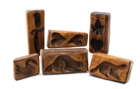 SIX CANADIAN CEDAR DAIRY MOULDS, carved and scorched with various motifs incl. beaver, hearts, bowie knife, etc.Provenance: private collection south WalesComments: decorative appeal