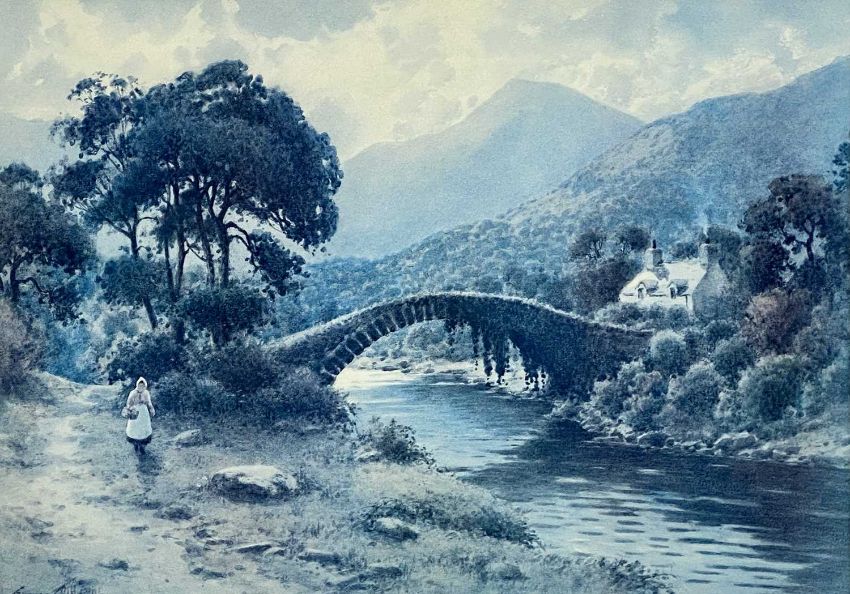 WARREN WILLIAMS (British, 1863-1941) limited edition colour prints published by North Wales Fine Art, with dragon blindstamps - (77/500) 'The Hanging Bridge at Betws y Coed', 5.5 x 48.5cms, (32/500) 'The River Glaslyn and Snowdon', 36 x 52.5cms, (169/500) 'The Golden Hour, Lligwy Bay, Anglesey', 35 x 51cms, and (550/850) 'Sunset Over Conwy', 39 x 58cmsProvenance: private collection Conwy