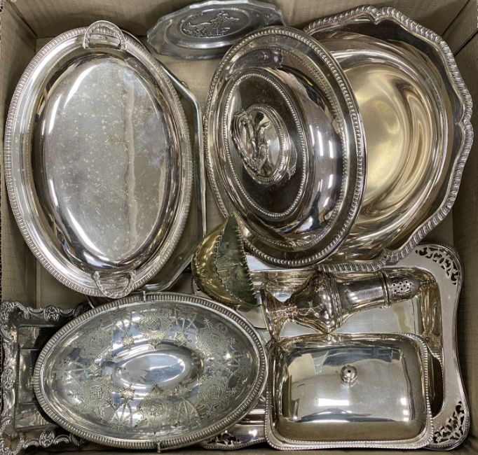 GOOD SELECTION OF VICTORIAN & LATER SILVER PLATED TABLEWARES, including a bright cut three-piece tea service, lidded entree dishes, bowls, swing handle baskets and other interesting items, within 2 boxesProvenance: private collection Gwynedd