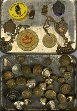 MIXED BUTTONS, BADGES & COINS GROUP, comprising military and other tunic buttons, silver and enamel and other amateur dancing medallions, 1976 Canadian Olympics medallion and one other on necklace chains, vintage and some current coinage, commemorative medallions and commemorative crownsProvenance: deceased estate Flintshire
