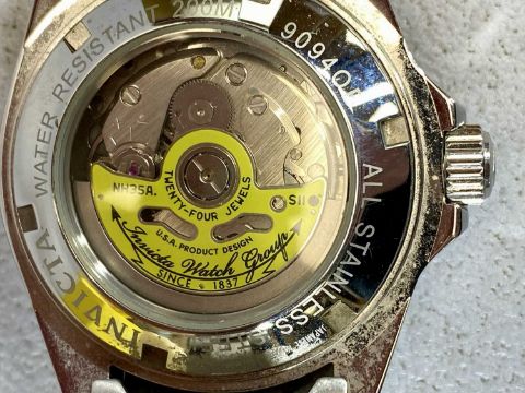 GENTS STAINLESS STEEL INVICTA AUTOMATIC PROFESSIONAL STAINLESS STEEL BRACELET WRISTWATCH, blue bezel and dial, with luminous hands, markers and date window, open view back with 24 jewel movement, good condition, appears working when listed, 40mm diam. case, original box, instructions, spare links and tagsProvenance: private collection Conwy