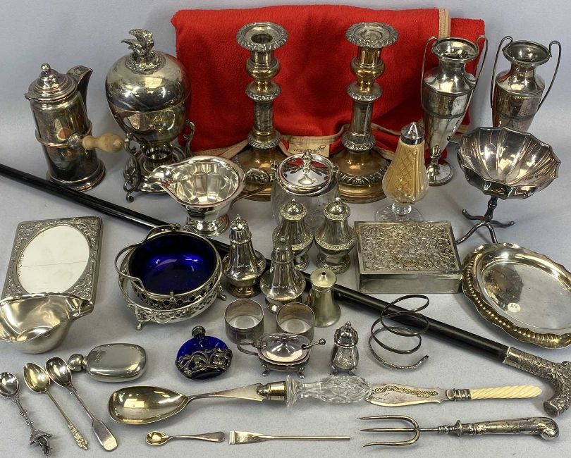 MIXED EPNS, VIRGIN ATLANTIC KNEE BLANKET & A WHITE METAL TOPPED EBONISED WALKING CANE includes a bird with nest topped EPNS egg coddler, condiment items, miniature hip flask, Bristol blue-type scent bottle, cutlery ETCProvenance: private collection Denbighshire