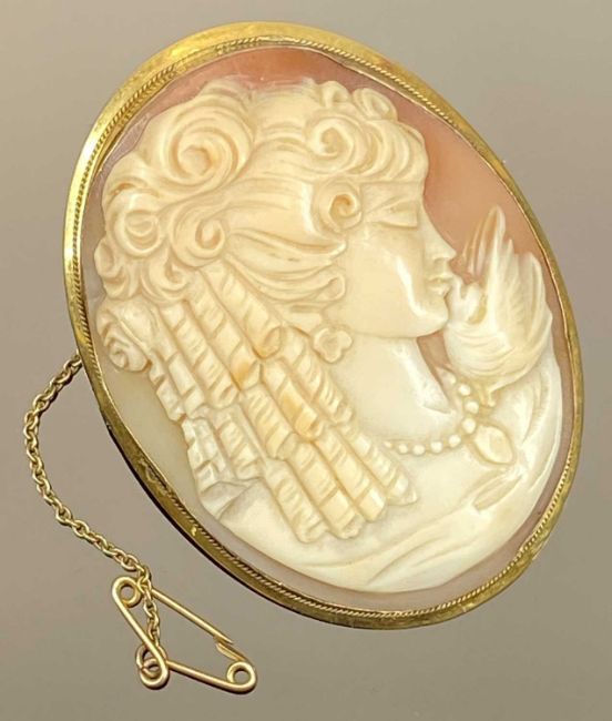 18CT GOLD FRAMED SHELL CARVED CAMEO BROOCH with head and shoulders depiction of a young woman, having ringlets to her hair with a bird on her shoulder, 5.5 x 4cms, 15.6g (incl. safety chain)Provenance: private collection Denbighshire
