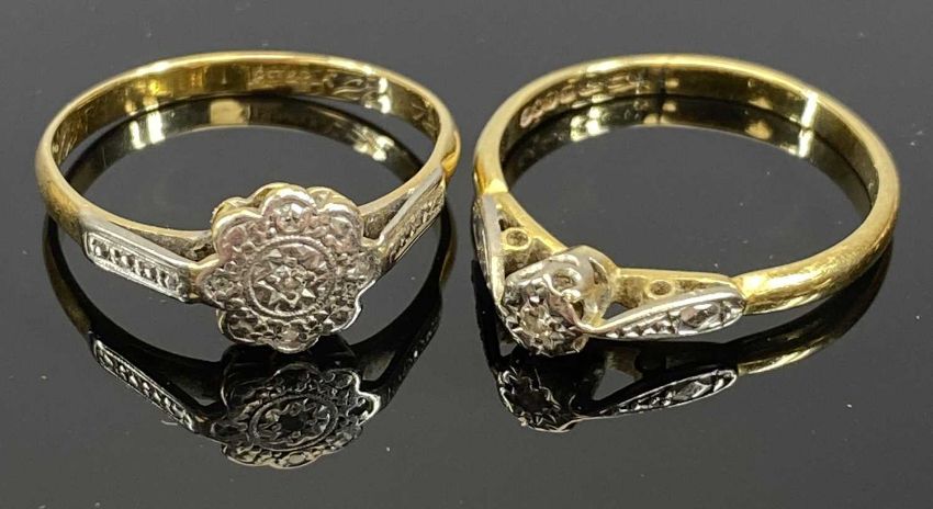TWO 18CT GOLD DIAMOND RINGS, MIXED GROUP OF MAINLY COSTUME JEWELLERY, COLLECTABLES ALONG WITH VINTAGE & CURRENT COINAGE, the two rings both having diamonds within illusion settings, with one being in floral form, size mid R-S, the other having a coronet setting against raised shoulders, size mid R-S, 61g gross, the coins to include 6 x collectable crownsProvenance: deceased estate Conwy