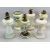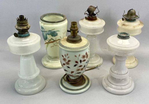FOUR OPAQUE WHITE GLASS OIL LAMP BASES, Victorian painted opaque glass oil lamp base converted to electricity, 26cms H (excl. fittings) and one other similar, 28cms H