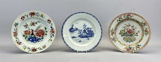 CHINESE PORCELAIN PLATE QIANLONG, painted in Famille Rose enamels with peonies, other flowers and a bird, 23cms diam., similar Chinese plate, 22.5cms diam., Chinese Famille Rose tankard, decorated with figures, 14.5cms H, and a Chinese porcelain blue and white plate, late 18th Century, 22.5cms diam.Provenance: private collection Gwynedd