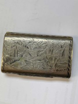 RUSSIAN SILVER & NIELLO SNUFF BOX, engraved front and back with peasant farmers, buildings and foliate borders, gilt interior with presentation inscription to East Sussex Club and dated 1936, 7.3cmsProvenance: private collection BridgendComments: surface rubbed, gilt rubbed.