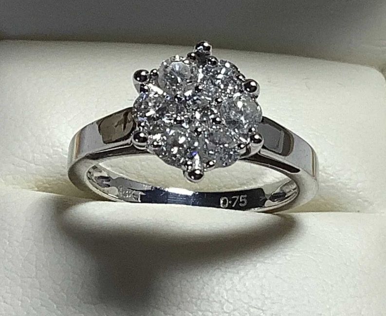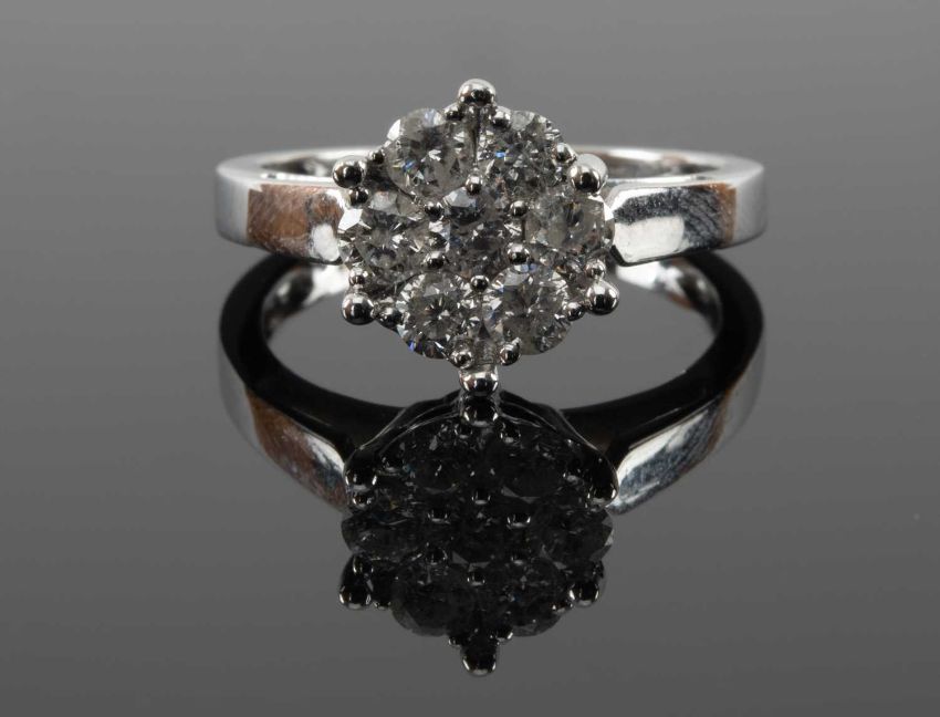 18KT WHITE GOLD SEVEN STONE DIAMOND CLUSTER RING, of flowerhead design, the round cut stones measuring 0.75cts overall approx., ring size M, 4.4gms, in J R Owen of Widnes ring boxProvenance: private collection Conwy County BoroughComments: good overall, some minor nicks to edge of stones, inclusions overall
