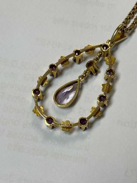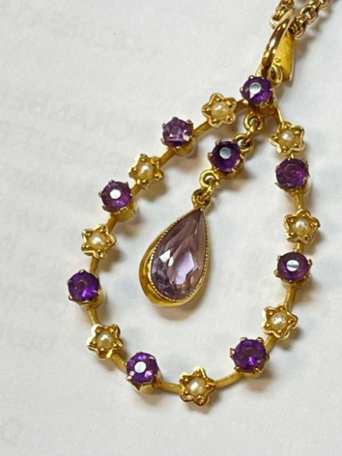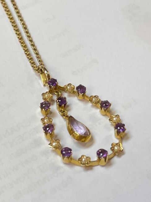 15CT GOLD AMETHYST & SEED PEARL PENDANT, with central drop pear shaped amethyst, on yellow metal chainProvenance: private collection DenbighshireComments: light wear and tear overall, all stones present, viewing recommended Condition Report:Stones and pearls all look good.The central pear shaped stone is paler.Some minor variation in colour with the other stones.Clasp functions as normal.The chain is 18.5cms