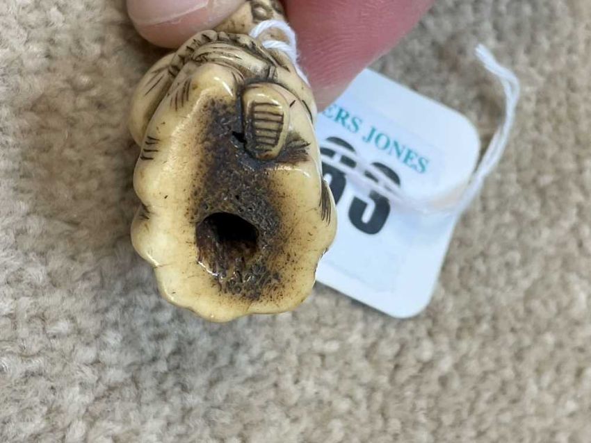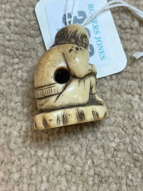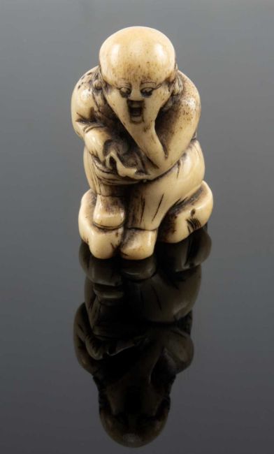 JAPANESE STAG ANTLER NETSUKE, Edo Period, stained and carved as a seated Sage holding his knee, single himotoshiProvenance: private collection CardiffComments: nicely worn patina.