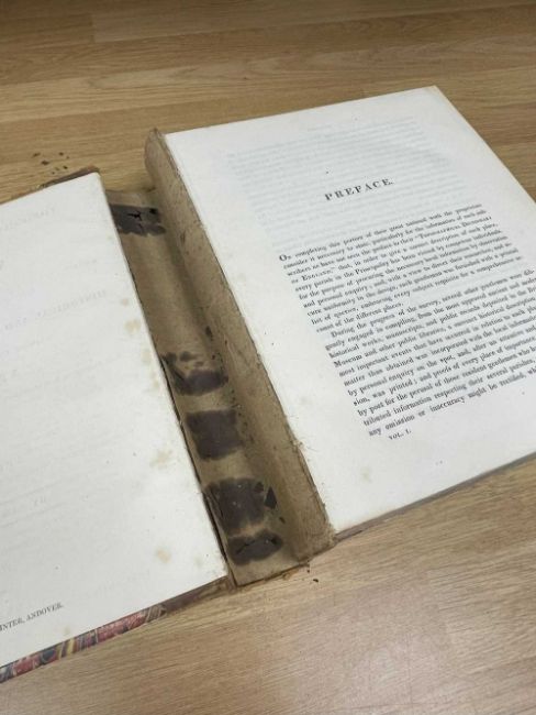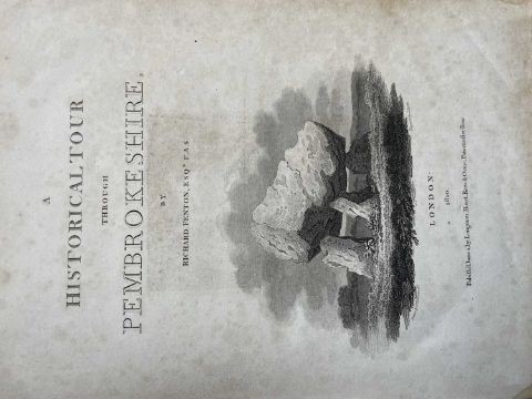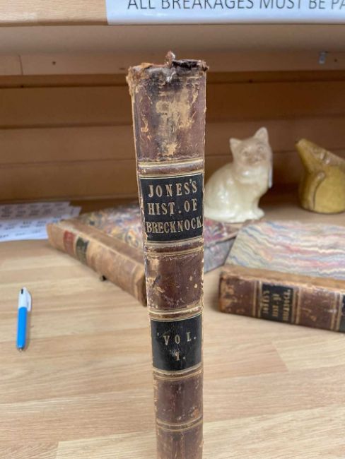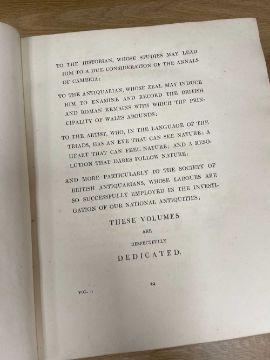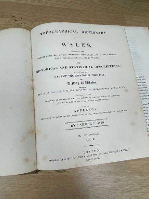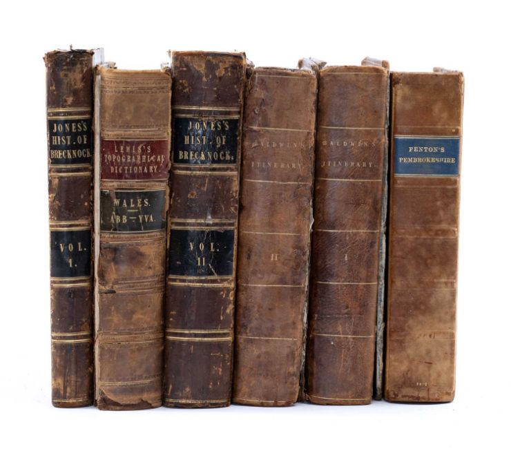 GROUP OF ANTIQUARIAN BOOKS ON WELSH TOPOGRAPHY comprising (1) two volumes GIRALDUS DE BARRI 'Itinerary of Archbishop Baldwin through Wales' 'Translated into English, and Illustrated with Views, Annotations and a Life of Giraldus, by Sir Richard Colt Hoare, for William Miller, London, 1806', both volumes with front boards loose, for restoration or rebinding (2) SAMUEL LEWIS 'A Topographical Dictionary of Wales' 'Comprising the Several Counties, Cities, Boroughs, Corporate and Market Towns, Parishes, Chapelries, and Townships with Historical and Statistical Descriptions, illustrated by Maps of the Different Counties and A Map of Wales, shewing The Principal Towns, Roads, Railways, Navigable Rivers, and Canals for S Lewis & Co, London 1833', binding is loose, for rebinding or restoration, (3) THEOPHILUS JONES Volume 1 & 2 'A History of the County of Brecknock' 'Containing the Chorography, General History, Religion, Laws, Customs, Manners, Language, and System of Agriculture used in that County', London 1805, three-quarter leather bound, marble boards (4) RICHARD FENTON 'A Historical Tour through Pembrokeshire', for Longman, Hurst, Rees & Orme, London, 1810, quarter calf leather bound, gilt title to blue panel upon ribbed spine (6 x volumes total in this lot)Provenance: private collection Monmouthshire
