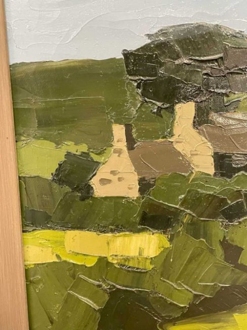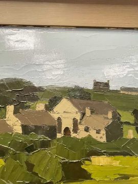‡ SIR KYFFIN WILLIAMS RA oil on canvas - landscape with fields and village to the centre, including chapel, under a blue sky, signed with initials, circa 1960s, 50 x 60cmsProvenance: private collection Cardiff, consigned via our Cardiff office, purchased John Noott Gallery, Broadway, Worcestershire 1988Comments: framed, minor cracks to the thicker paint application on the right side, canvas stabilised verso