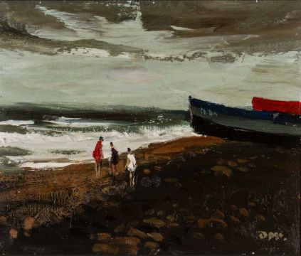 ‡ DONALD McINTYRE oil on board - figures on shoreline with fishing boats, signed with initials, 25 x 29cmsProvenance: private collection, LondonComments: framed & glazed, ready to hang