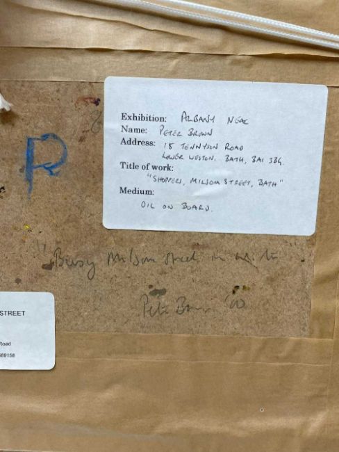 ‡ PETER BROWN oil on board - entitled verso, 'Shoppers, Milsom Street, Bath' on Albany Gallery label, signed and dated 2000, 19 x 23cmsProvenance: private collection CardiffComments: framed and glazed, ready to hang