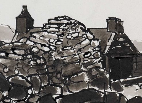 ‡ SIR KYFFIN WILLIAMS RA ink and wash - upland stone dwelling and drystone walls, signed with initials, 36 x 55cmsProvenance: private collection, consigned via our Mid-Wales officeComments: framed and glazed, ready to hang