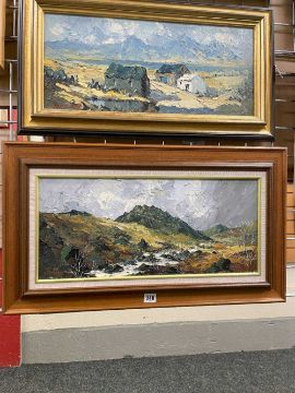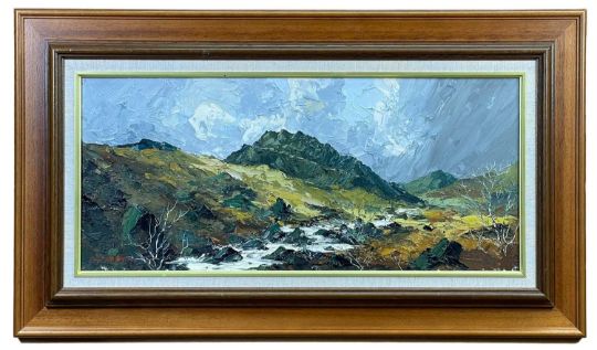 ‡ CHARLES WYATT WARREN oil on board - Eryri (Snowdonia) mountain range with stream and silver birch trees, signed, 24 x 54.5cmsProvenance: private collection Conwy, consigned via our Colwyn Bay officeComments: framed & glazed, ready to hang