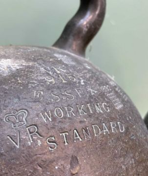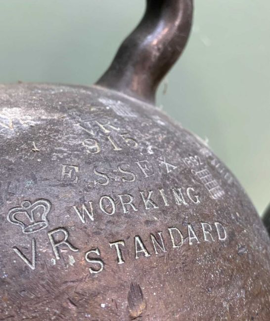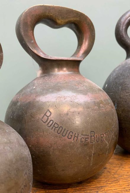 TWO GROUPS IMPERIAL BRASS STANDARD WEIGHTS, comprising Borough of Burton on Trent 7lbs, 14lbs and 28lbs kettle weights by W & T Avery Ltd, Birmingham, and Victorian no. 915 Essex Working Standard 59lbs, 28lbs and 14lbs kettle weights, VR stamps and various dates (6)Provenance: private collection Cardiff