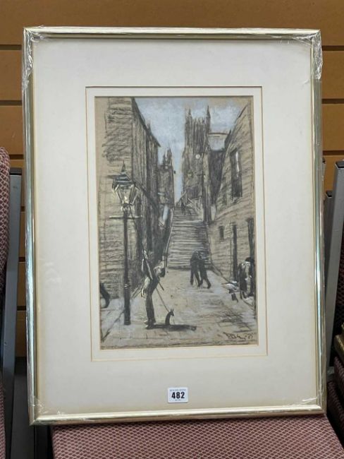 ‡ HAROLD RILEY DLitt FRCS DFA ATC (1934-2023) pastel - Stockport Parish Church, a lamplighter below steps leading to the church, signed and dated (7?)8, 38 x 24cmsProvenance: private collection North Wales by descent; Collection of D.C.I. Tony Fletcher, Greater Manchester Police, who was good friends with Riley and Lowry. Riley gifted several works to Tony, of which this is one. Seven others from the collection were sold at our Colwyn Bay saleroom in 29 August 2023. Riley also agreed to illustrate Tony's book 'Cobbled Beat'.Comment: framed and glazed ready to hang.