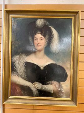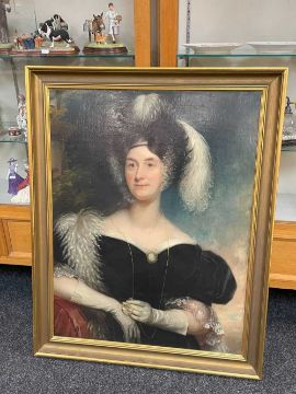 CIRCLE OF GEORGE HAYTER (1792-1881) oil on canvas - portrait of lady in feathered bonnet wearing velvet dress ornamented with cameo, kid gloves and holding lornettte, 90 x 70cmsProvenance: collection of the Late Dai Evans, former Director of Picton Castle and former curator of Petworth HouseComments: relined and retouched, cleaned. Condition Report:There is some wear to the top corners of the canvas (see attached)There is light craquelure