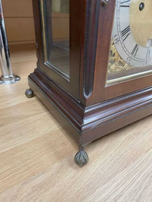 LATE 18TH C. MAHOGANY BRACKET CLOCK, John Wightwick, bell top with handle and four cone finials, over glazed sides and moulded angles on a plinth base to claw and ball feet, the signed brass 5.75 inch dial with silvered chapter ring with Roman and Arabic numerals, matt centre with calendar aperture and pendulum window, strike/silent and regulation dials in the arch, the twin gut (now wire) fusee movement with four knopped pillars and engraved and signed backplate, verge escapement with pull repeat playing on six bells, 43cms h (incl. handle)Provenance: private collection south WalesComments: repeat draw string broken, ticks and strikes, feet and finials probably replaced, other minor restorations.