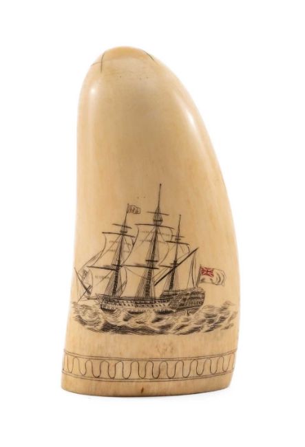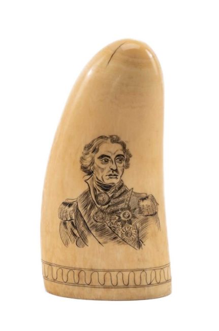 SCRIMSHAW WHALE TOOTH, carved and stained with half length portrait of Admiral Lord Nelson reversed with portrait of H.M.S.Victory in waves, serpentine border, 11.2cms hProvenance: private collection north WalesComments: very good. Please be aware that this lot contains material which may be subject to import/export restrictions, especially outside Great Britain, due to CITES regulations. Please note it is the buyer's sole responsibility to obtain any relevant export or import licence. For more information visit https://www.defra.gov.uk/ahvla-en/imports-exports/cites/