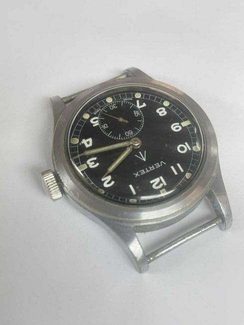 VERTEX WORLD WAR II MILITARY WRISTWATCH, one of the famous 'Dirty Dozen' collection, the black dial signed 'Vertex', broad arrow, luminous Arabic numerals, white outer minute track with luminous dot 5 minute markers, subsidiary seconds at 6, polished hands with luminous inserts, brushed and polished round chrome plated case, screw down back engraved 'W.W.W ↑ A1202 3514118', fixed bars, later strapProvenance: private collection Swansea by descentComments: chrome plating worn, scratches and scuffs, ticking not tested long term, viewing recommended